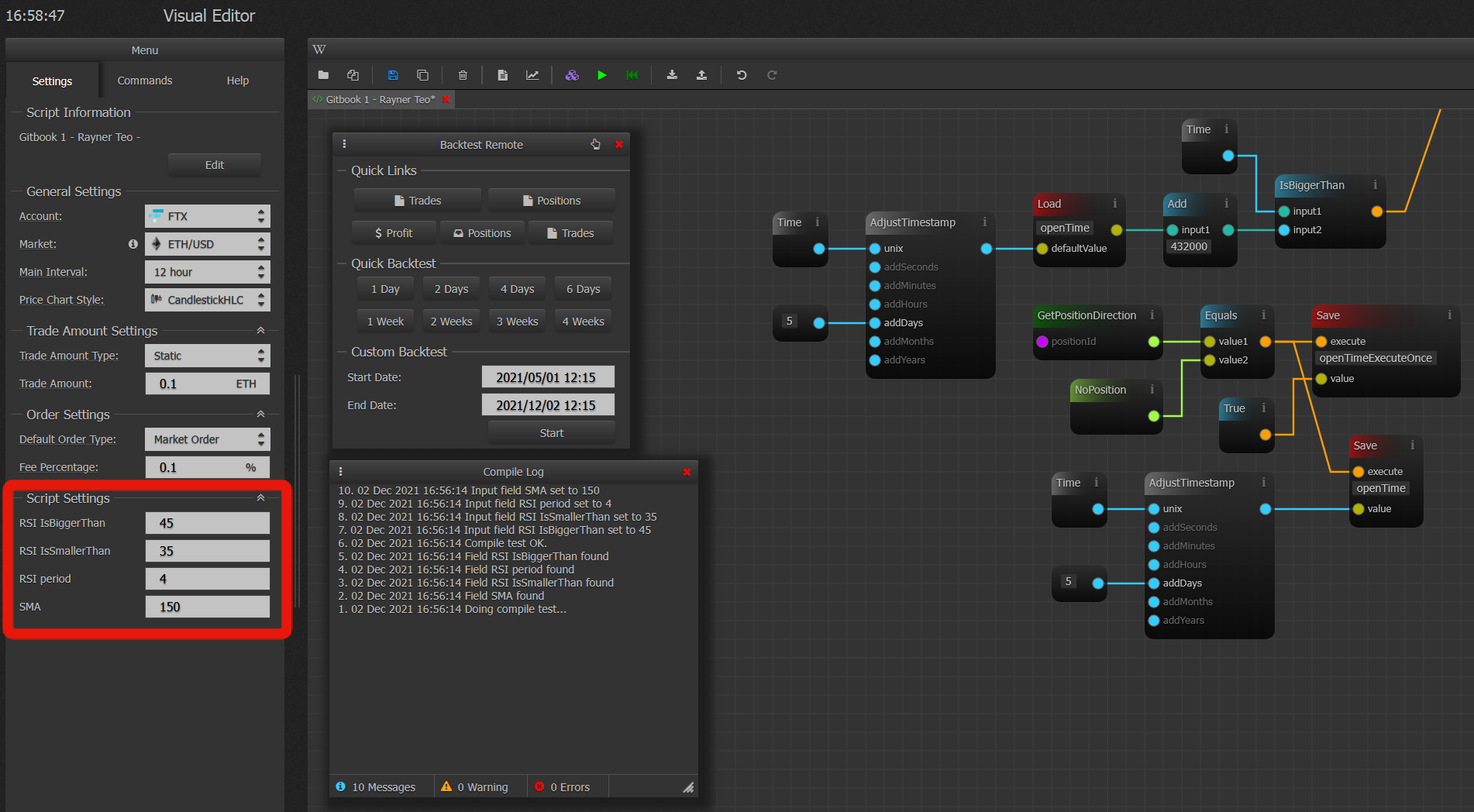 Going back into our Visual Editor, opening the Backtest Remote we first make sure we have the hard-coded values correct (12hours expressed in seconds & 5 days end trigger for the order). Then we adjust our Script Settings to the best performing result from Haas Labs and run confirmation tests.