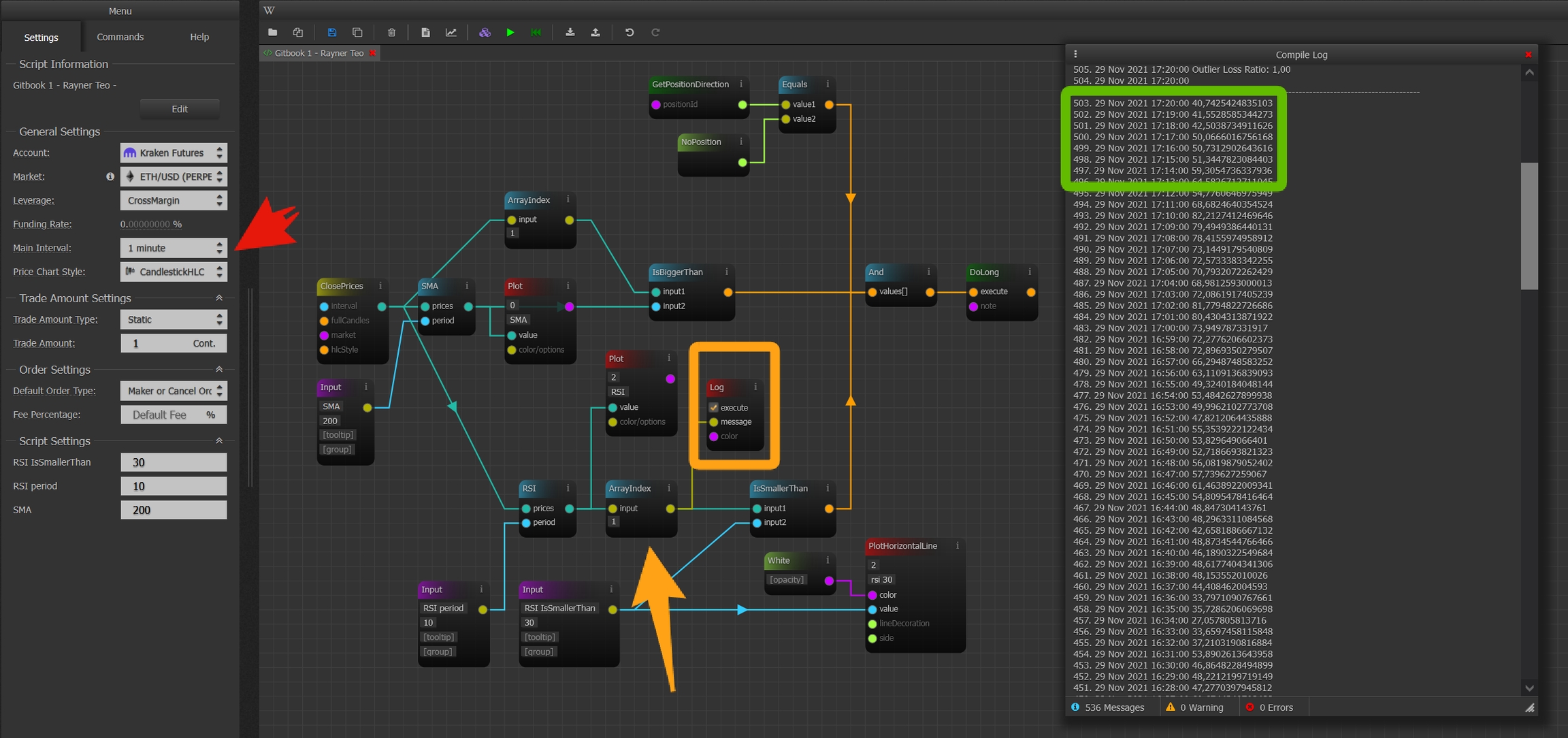 You can see where the bot took the position (green circle) based on the signal (where the bottom blue RSI line is below the white 30-value line from our Input block.