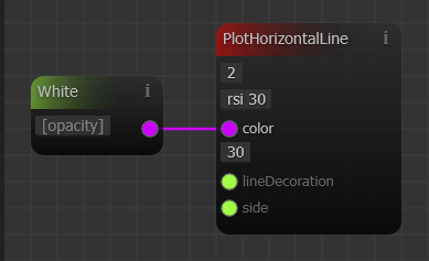 We also add a simple PlotHorizontalLine to the bottom part of our chart to be able to see the 30-value of the RSI more easily. Remember that we chose 2 for chartId, because that is where we plot our RSI and we want the line to be visible on that part of the chart. Right-clicking dots allows to change it to fields to enter values if you don't want to add an Input block.
