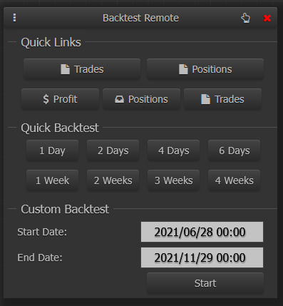 At this point in time we are ready to Save and give our bot our first test-drive to double check if our entry trigger setup worked. To do that we click on the Quick Backtest button above or you can define a longer timeframe by opening the Backtest Script (Backtest Remote) and customize your timeframe.